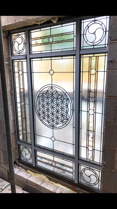 Above: Artisan made stained glass panel triple glazed inside sealed units above the entrance of a large new build home in Bowdon, England, 2021.