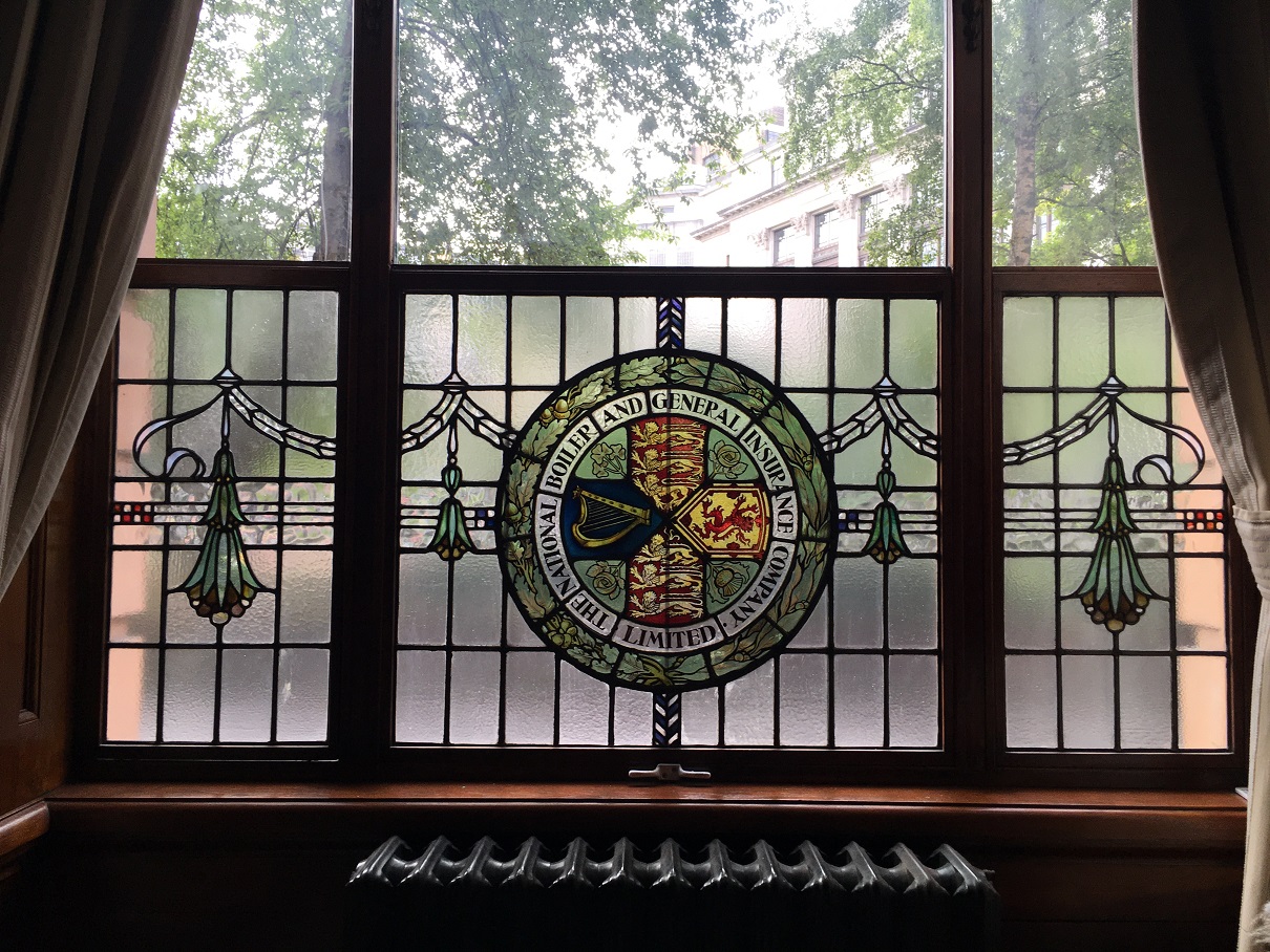 Below: Recently restored hand painted detail and extensive repairs for an original window in central Manchester, August 2022