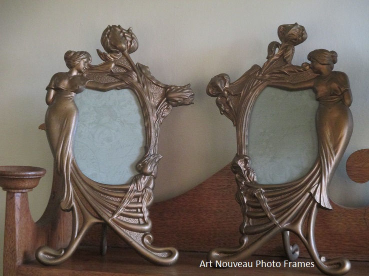 Below: A matched pair of Art Nouveau cast metal picture frames - notice how the designs change to make them a real pair and not just a repeated pattern each way. Perfect condition, painted with a gold paint. Have the original registered number cast into the back of both framea. Sizes: 20cm W X 35cm H each.
