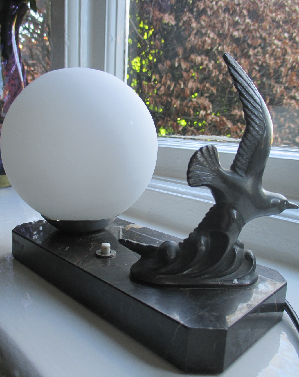 Below: Original Art Deco marble based lamp with metal bird. Fully working with original switch and full PAT test included in cost. Shade is not original but same style shape and size. Measures 120mm total width incl shade and 170mm total height. Marble base alone measures 200mm wide x 90mm high. Price £140.00 plus postage and packing.